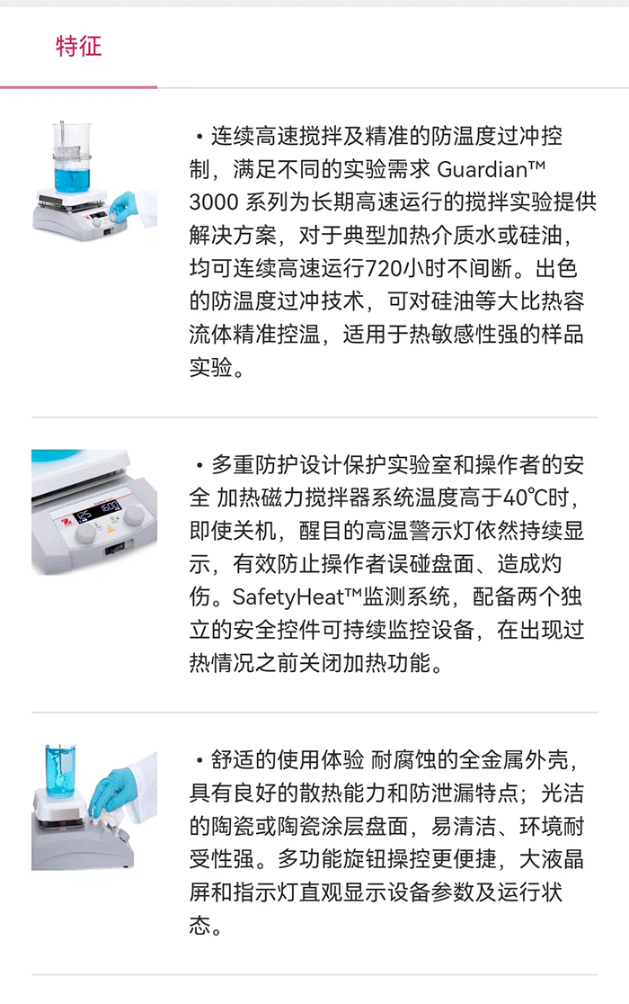 数控加热磁力搅拌器,设计安全、强劲搅拌和快速加热、高性价比奥豪斯 Guardian 3000? 加热磁力搅拌器设计用于所有实验室环境,进行加热和搅拌的高性价比设备。清晰的LCD显示屏能读取设置的温度和搅拌速度以及其实际值,且当加热器高于40°C时,更加直观突出的高温警示标识灯将亮起。该系列提供三种板尺寸,以满足您的实验室应用。该系列的所有型号均支持与可选温度探头一起使用,以精确控制样品温度。